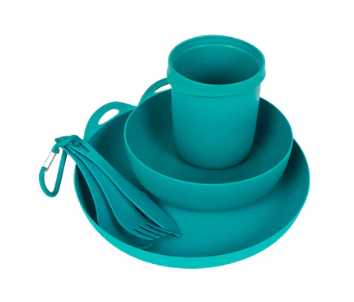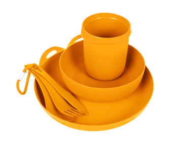 Mug, Bowl: Glass Reinforced Polypropylene; Plate & Cutlery: PP with 30% glass; Stuff Sack; polyester mesh & nylon ripstop fabric