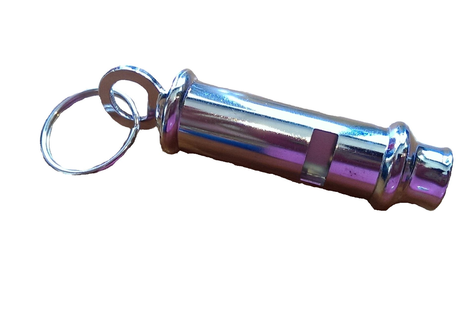 Metal whistle for use at camp or during outdoor activities. Can be attached to a lanyard.